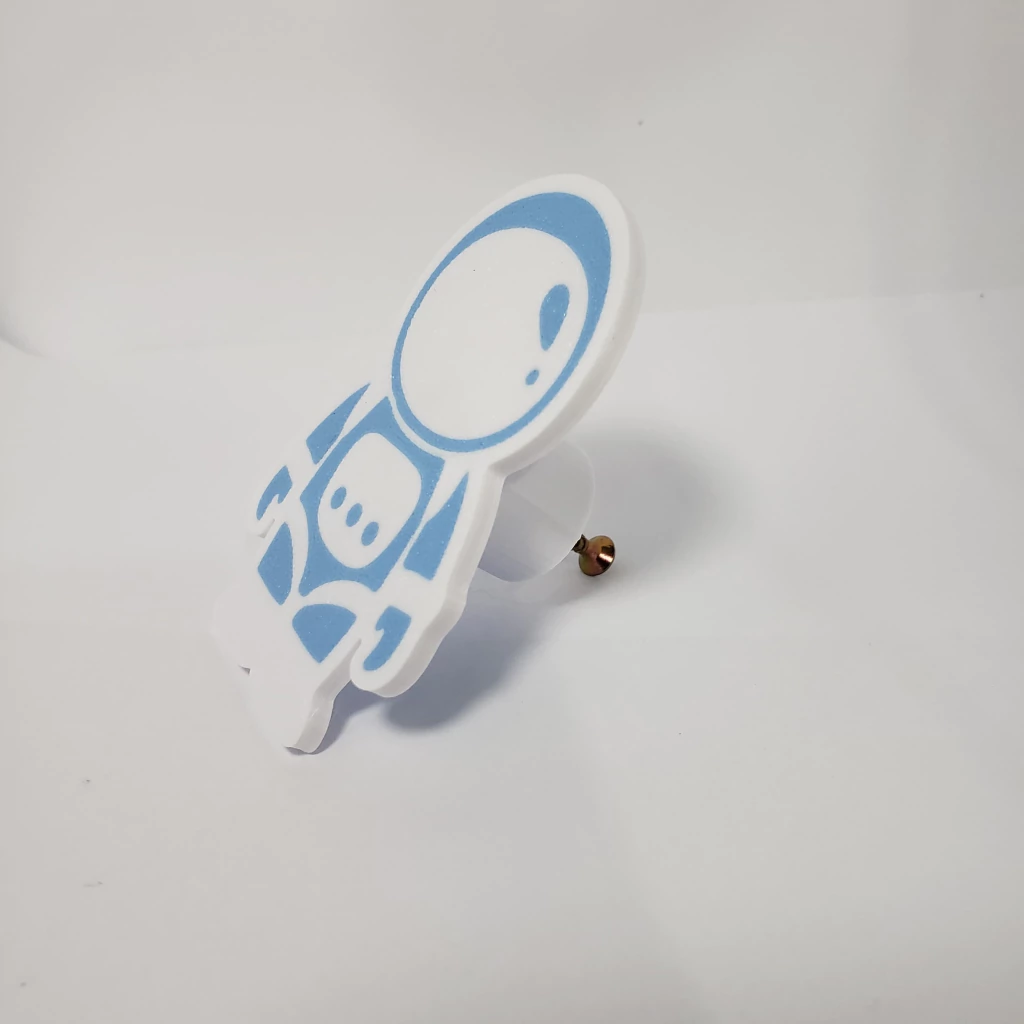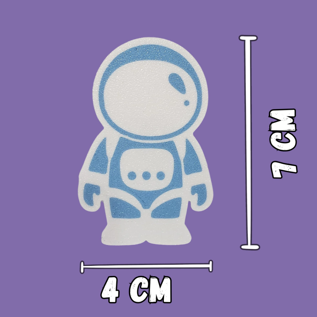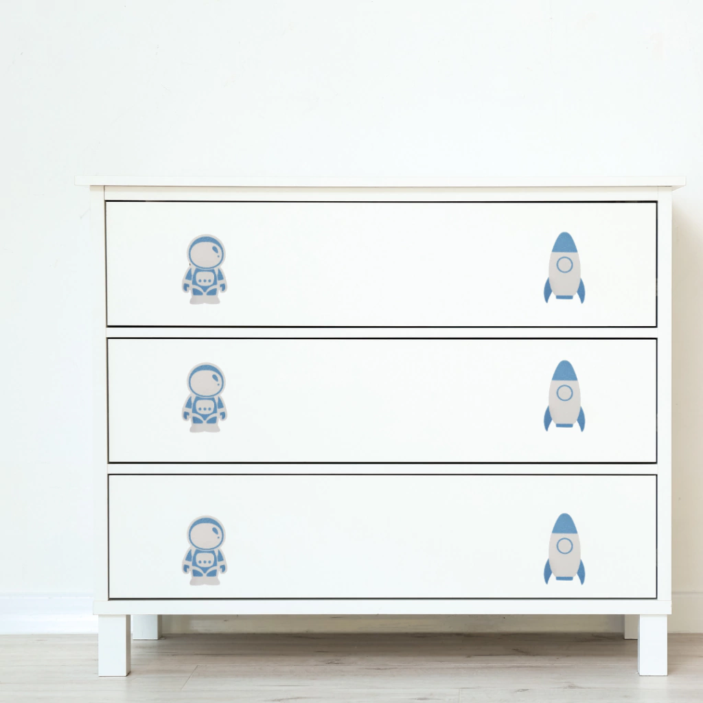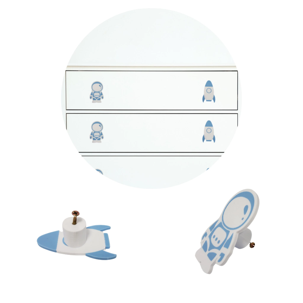 DESIGN INFANTIL: Conjunto de puxadores com tema espacial, apresentando astronauta e foguete em tons de branco e azul claro